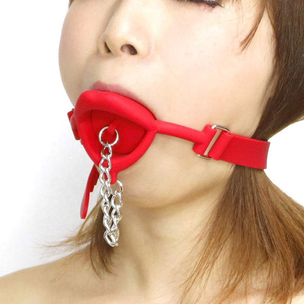 鎖から伝い滴り落ちる唾液にフェチ心くすぐられるリップ型のギャグ(口枷)。