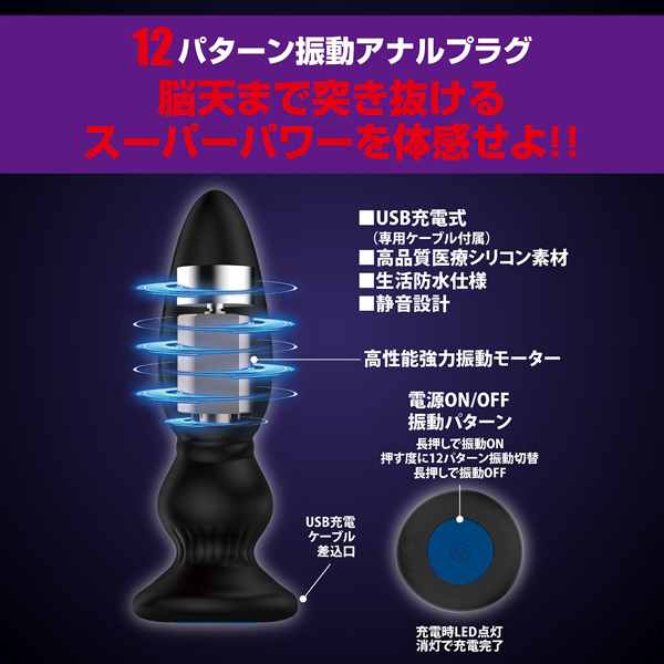 肛門に装着してスイッチON!電源のオンオフから12種類の豊富な振動パターンまで、1つのボタンを押すだけの簡単操作で楽しめる♪素材には肌に優しく滑らかな医療用シリコンを採用!安心安全のUSB充電式アナルプラグです。